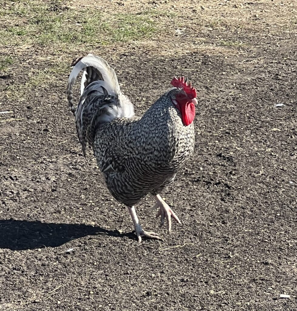 Now, mind you, I have been here for a few months and him and I have been on good terms until a week or so ago, when he spurred me in the back of my leg. I’ve tried to keep my eye on his whereabouts since, and try not to have my back to him if I can help it, but yesterday morning, he was no where to be seen…only felt. When I spun around, he fluffed up his neck feathers and came at me again. He managed to get me muddy AND put a hole through both my shirt and my britches! I kicked at him and he gave us some distance, but while I was opening the door to get to the feed, he got me in the back of my leg again.